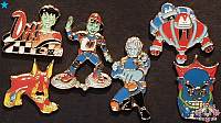 A set of 6 miniature metal pins; Dot with the top of her Diner, Hack & Slash, Megabyte's face, Bob, Enzo & Frisket.